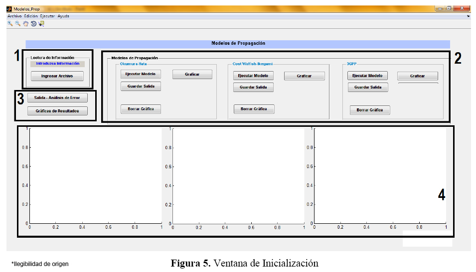 La Figura 5 muestra la ventana de inicialización y su estructura, se observa la distribución de cada elemento y el diseño del mismo. La sección 1 de la Figura 5, es utilizada para cargar los datos en el sistema, la sección 2 es empleada para seleccionar el modelo de propagación a ser usado; para realizar el análisis de los cálculos realizados por el sistema, se utiliza la sección 3; finalmente la sección 4 despliega las gráficas de la potencia con respecto a la distancia.