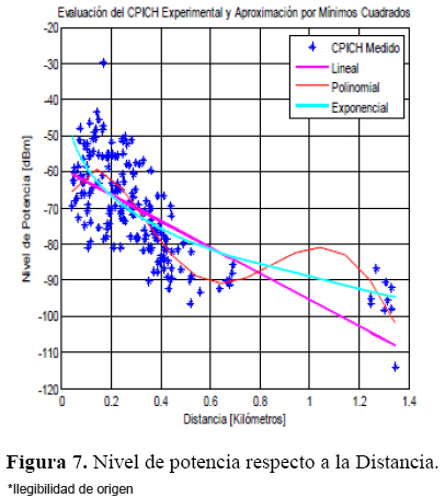 El sistema despliega gráficas de la potencia medida en campo respecto a la distancia (Figura 7), y para facilitar la interpretación de resultados, el sistema genera una curva que se aproxima al comportamiento de las muestras. La curva se genera por medio de una regresión numérica por el método de mínimos cuadrados.