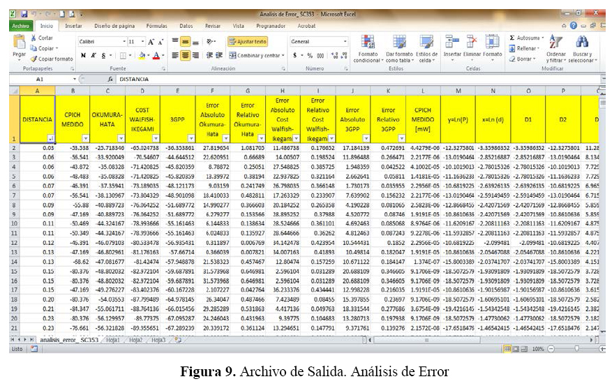 El sistema computacional produce una serie de gráficas y datos para poder analizar cada modelo de propagación y ejecutar un análisis de error dando como resultado un archivo de texto delimitado por tabuladores que puede ser importado a una hoja de cálculo como Microsoft Excel y realizar cálculos sobre la misma. La Figura 9 muestra el formato de salida importado para el análisis de error.