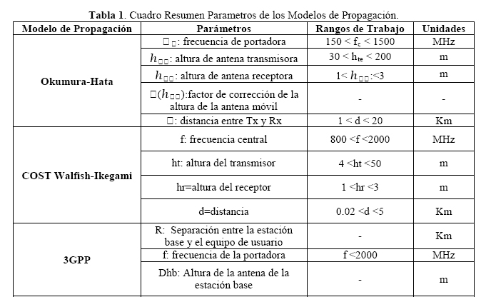 La Tabla 1, presenta un cuadro resumen con los parámetros, rangos de operación y unidades para cada uno de los modelos de propagación presentados anteriormente.