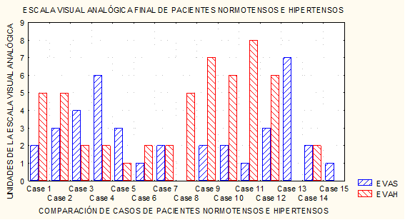 En la Gráfica 4 se muestra los resultados de la EVA para autoevaluar el dolor por el paciente al final del procedimiento quirúrgico, se observó tendencia a tener mayor puntuación el grupo con hipertensión, sin embargo, no hubo diferencia significativa entre los grupos (p=0.246).