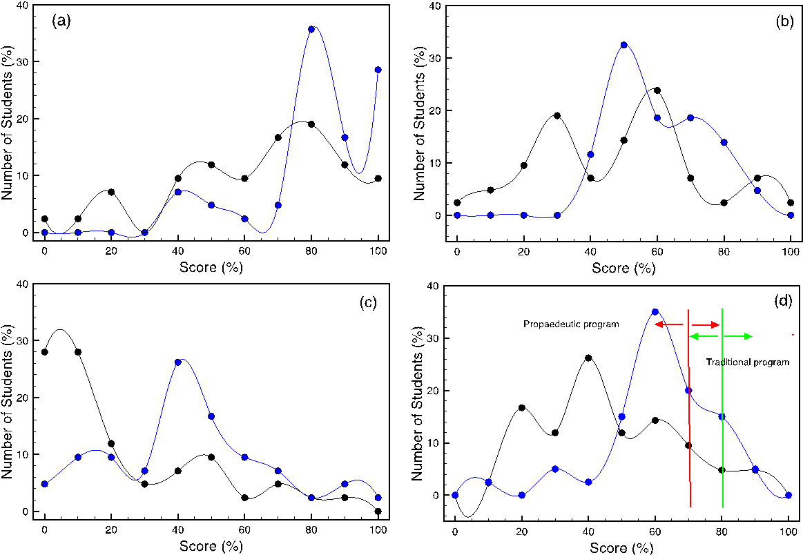 We have examined the students performance in Arithmetics, Trigonometry and Algebra prior to the two-week courses (Pre) and after it (Post), Fig. 2 (a), (b) and (c). In the case of Arithmetics the pre student scores are distributed almost equally between 40 to 100 %, with the number of students oscillating between 10 to 20 % of the total and the highest number of students (20 %) presenting at 80 % pre student score, black dots of Fig. 2a. The post student scores clearly shift to high scores with a maximum of 40 % of the number of students at a score of 80 %, blue dots Fig. 2a. In the case of Trigonometry comparing the pre and post student scores there is a shift to high scores, however a maximum is presented at a score of 50 % representing more that 30 % of the number of students, Fig. 2b. For Algebra the trend is totally opposite with respect to Arithmetics since most students show low pre scores, 0 to 30 %, and only a reduced number of them scores between 80 to 100 %, black dots Fig. 2c. After the two-week Algebra course the student scores clearly shift to high scores with a maximum of the number of students at a score of 40 and slight modifications in the high score range, blue dots Fig. 2. In Fig. 2d, we show the average of student scores taking over the three mentioned courses finding a shift to higher scores comparing the pre and post scores. There is a maximum in the number of students at a post score of 60 representing a shift of 20 % with respect to the pre student score maximum. Interesting to note is that in the high score range (90 and 100) the number of students is practically the same before and after the two-week courses, meanwhile in the score range of 70 to 80 there is a moderate increase in the number of students post two-week courses representing 35 % of the number of students. These scores are the reference that determines what students go to the propaedeutic or traditional program. In Fig. 2d we include two vertical lines, red and green, that fulfill these criteria. If the green vertical line is the reference, then the students that go to the traditional program are 20 %, whereas a 40 % is found if the red vertical line is chosen.