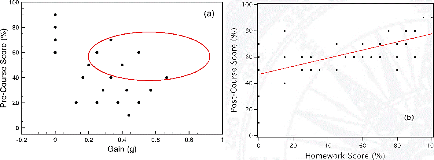 To know more about the students performance we have calculated the normalized learning gains as a function of the pre course scores and the correlation coefficient of post course scores to homework scores following (Finkelstein 2005, 010101). In the case of learning gains it is found that the pre high scores have practically null gain and that the increase at reference scores comes from low gains with moderate pre-course scores and moderate or high gains with low pre-course scores, black dots inside the red circle in Fig. 3a. In the case of overall performance, post-course scores, to homework scores we find that the correlation coefficient is r = 0.65 indicating that students who performed well on homework did well in the courses as well as that even when the courses are short (two weeks) they are well integrated, Fig. 3b. Similar values for the correlation coefficient have been found in tutorial studies (Finkelstein 2005, 010101).