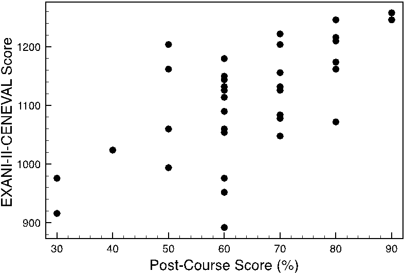 To end this subsection we analyze the correlation of the scores of the 2010 official test EXANI-II-CENEVAL with respect to the post-course scores, Fig. 4. As it is clearly seen there is a perfect correlation between the top five scores, meanwhile the rest of scores show a considerable dispersion pointing out that if the official test is taken as the selection process only a reduced number of students could be selected for the traditional program. Besides, it is important to mention that the students selected to the traditional program correspond to those that are at or above the red vertical line of Fig. 2d indicating that the reference score of the 2010 selection process is 70 %.