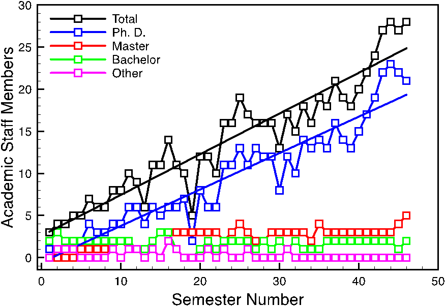 Figure 5 Academic Staff evolution per semester from 1987 to 2010. The black curve corresponds to the total staff members, meanwhile the blue, red, green and magenta represent the members according to the staff degree: Ph. D., Master, Bachelor and other, respectively.
