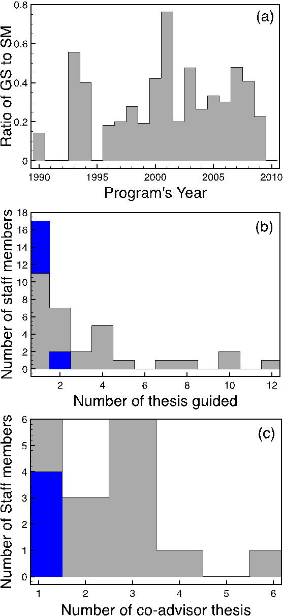 Figure 7 (a) Ratio of the graduated students to the staff members per program’s year since 1990 to 2010. (b) Number of staff members versus the number of thesis guided, the gray and blue historgrams correspond to staff members of the UAF-UAZ and external to it, respectively. (c) Distribution of co-advisors internal (Gray) and external (Blue) to UAF-UAZ.