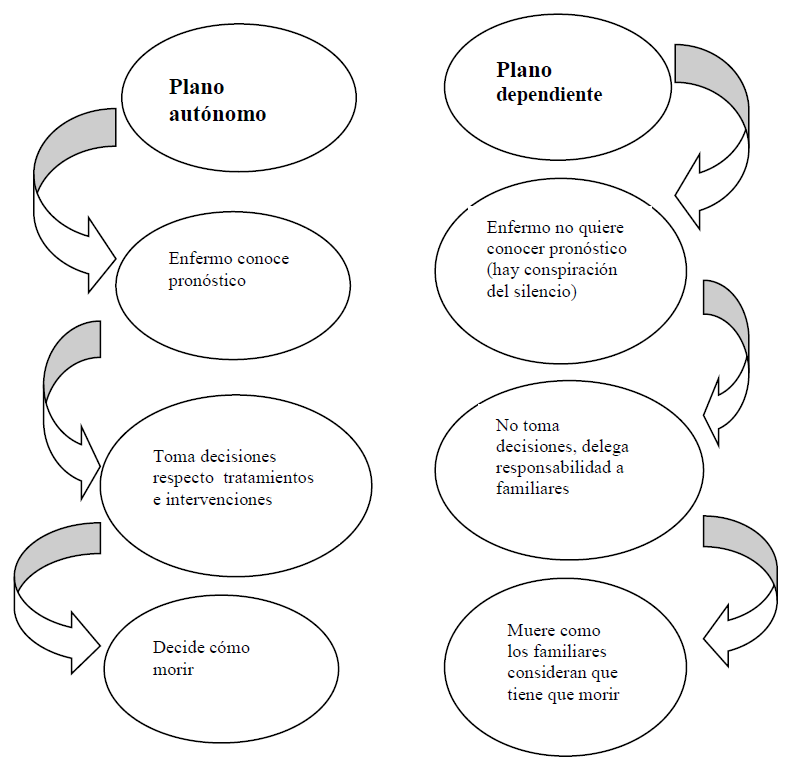 La información muestra que existen dos planos en los que se toman las decisiones, un plano autónomo y un plano dependiente. Está aquél en el que el enfermo quiere tomar sus decisiones de cómo morir (plano autónomo) y aquél en el que el enfermo no quiere conocer su pronóstico y desea que sea el cuidador o la familia la que tome las decisiones (plano dependiente)(figura 1).