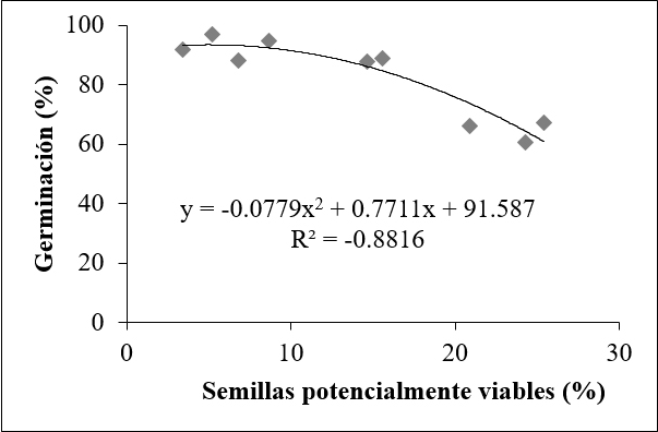 Aunque los embriones de las semillas potencialmente viables presentaron tinción en la prueba de TTC (color rosa), se infiere que sólo algunas pudieron germinar, ya que el porcentaje de germinación estuvo correlacionado de manera negativa (R2 = -0.88, P≤0.05) con la presencia de semillas potencialmente viables (Fig. 8). Estos resultados contrastan con los obtenidos con Cattleya walkeriana y C. tigrina en donde fue necesario considerar las semillas viables (color rojo) y potencialmente viables (color rosa) para calcular con mayor precisión el porcentaje de germinación (Hosomi et al., 2011).