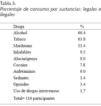En la tabla 3 se muestran los porcentajes de consumo de las sustancias más consumidas por la muestra de adolescentes, encontrándose que el alcohol y el tabaco fueron las drogas legales de mayor consumo; seguido de la marihuana y los inhalables como sustancias de tipo ilegal.