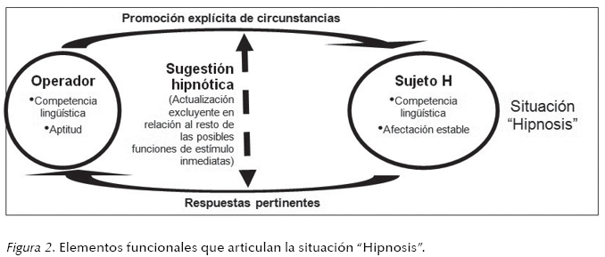 En la Figura 2 se muestran los elementos funcionales que articulan una situación hipnótica. La función del operador, estructurada a partir de la competencia lingüística y la aptitud en el manejo de ciertas técnicas, promueve o induce de manera explícita determinadas circunstancias para la función del Sujeto Hipnótico (Sujeto H). La función del Sujeto H, que se estructura a partir de la competencia lingüística y la disposición para mantener una afectación estable, exhibe respuestas pertinentes a las circunstancias promovidas por la función del operador. La relación que hay entre las circunstancias que la función de operador induce o promueve y las respuestas pertinentes de la función del Sujeto H se puede llamar Sugestión Hipnótica, que implica una actualización de la función de estímulo en torno a los elementos que se presentan en esta misma relación y que excluye al resto de las posibles funciones de estimulo que se encuentran de manera inmediata en la situación.