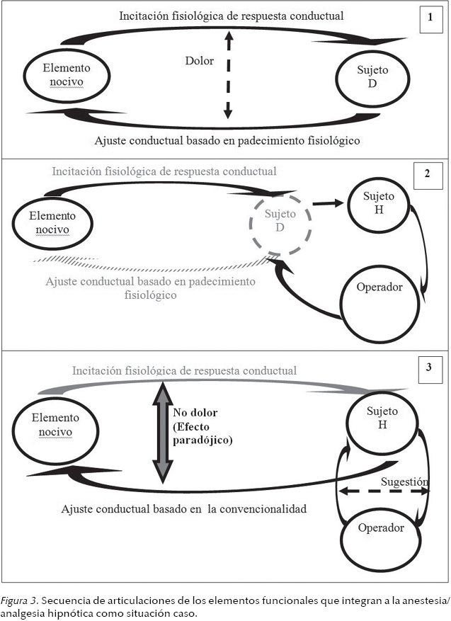 La Figura 3 muestra la secuencia de articulaciones que dan pie a la anestesia/analgesia hipnótica como una situación caso. En el cuadro 1 se muestra la articulación de la situación "Dolor", como ya se mostró antes (en la Figura 1), mientras que el cuadro 2 presenta la introducción de la función de operador en la situación de dolor (Ver también figura 2). La función de operador promueve las circunstancias para que la función del Sujeto D (Sujeto Doliente) cambie por la función de Sujeto H (Sujeto Hipnótico). La función del elemento nocivo incita fisiológicamente una respuesta conductual, pero el ajuste conductual basado en el padecimiento fisiológico no logra completarse porque el lugar de la función del Sujeto D fue tomado por la función del Sujeto H. El cuadro 3 hace explícito que los elementos funcionales de la situación hipnótica (Sujeto H, Operador y Sugestión) promueven un ajuste conductual basado en la convencionalidad que sustituye al ajuste basado en el padecimiento fisiológico. Es por esto que hay un efecto paradójico: mientras la función del elemento nocivo continúa la incitación fisiológica de una respuesta conductual, se presenta un ajuste basado en la convencionalidad que es contrario a lo esperado. La visión general de esta secuencia se muestra en la Figura 4 donde se presenta el panorama general de la articulación de la anestesia/analgesia hipnótica como una situación caso de fSR. La relación Operador-Sujeto H, que implica la articulación de la Sugestión, constituye un referente que media la interacción de la función del sujeto D con el Elemento Nocivo.