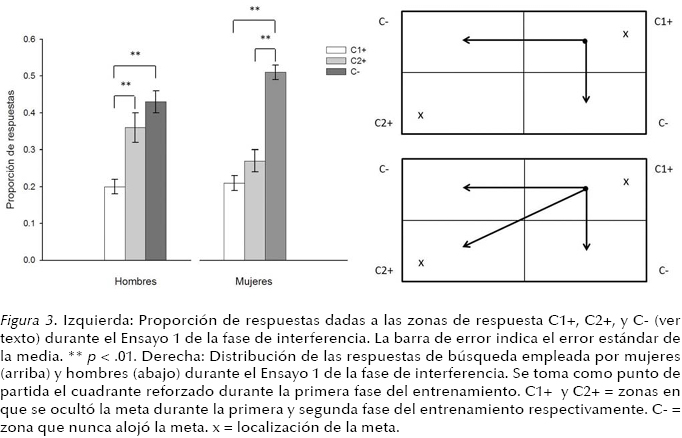 Bajo las consideraciones antes descritas, la distribución de respuestas de exploración para el Ensayo 1 de cada fase del entrenamiento fue analizada a través de un ANOVA 2 x 3 con los factores sexo (hombres vs. mujeres) y zona de respuesta (C1+, C2+, C-). En el caso de la fase de adquisición, este análisis reveló un efecto principal sólo para el factor zona de respuesta, F (2, 186) = 9.85, p < .001; comparaciones subsecuentes (DHS) revelaron que una sola zona (i.e. C1+) concentró la mayoría de las respuestas de exploración, independientemente del sexo de los participantes, p < .05. Este resultado indica el uso de la misma estrategia de búsqueda en ambos sexos durante este ensayo. En lo que respecta a la fase de interferencia, se detectó un efecto principal para el factor zona de respuesta, F (2, 186) = 30.87, p < .001, y una interacción Sexo x Zona de respuesta, F (2, 186) = 3.20, p < .05. El análisis de esta interacción Sexo x Zona de respuesta se llevó a cabo por medio de dos ANOVAS unifactoriales, uno para cada sexo, mismos que revelaron diferencias en la distribución de respuestas de exploración en ambos sexos, hombres, F (2, 93) = 9.06, mujeres, F (2, 93) = 33.39, p < .001. Comparaciones subsecuentes (DHS) confirmaron que en este caso los hombres respondieron menos a la zona C1+ que a la C2+ y a la C-, mientras que las mujeres respondieron más a C- que a C1+ y a C2+, p < .01. Ninguna otra comparación resultó significativa, p > .05. Este resultado indica que en este ensayo ambos sexos exploran con menor frecuencia el área que circunda la primera ubicación conocida de la meta; sin embargo, en la búsqueda de la nueva ubicación de la meta los hombres distribuyeron sus respuestas de exploración de forma equitativa en el área total restante, mientras que las mujeres lo hicieron sólo en las áreas adyacentes en dirección vertical u horizontal a la ubicación de la meta conocida (ver Figura 3).