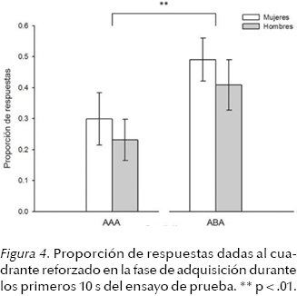 A fin de identificar en los grupos un efecto de interferencia o de renovación contextual, se cuantificó la proporción de respuestas dadas al cuadrante reforzado en la primera fase del entrenamiento (i.e. fase de adquisición) durante los primeros 10 s de la fase de prueba. Éstas se presentan en la Figura 4. Un ANOVA 2 x 2 con los factores condición (AAA vs. ABA) y sexo (hombres vs. mujeres) reveló un efecto principal sólo para el primero, F (1, 60) = 5.86, p < .01. Lo anterior indica que en el lapso considerado relevante para el ensayo de prueba hubo un incremento en la tendencia a responder al cuadrante reforzado en la fase de adquisición en los grupos expuestos a la condición ABA, pero no en aquellos expuestos a la AAA, lo que es consistente con un efecto de renovación contextual y uno de interferencia respectivamente. Adicionalmente, esto ocurrió con independencia del sexo de los participantes.