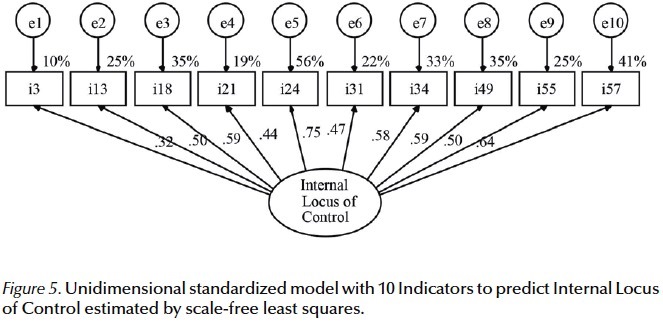 A unidimensional model with 10 indicators was also developed to predict internal locus of control. All parameters were found to be significant. Each of the items accounted for or predicted from 10 to 56 percent of the variance with a mean percentage of 30. The indexes for data adjustment were good: χ2/df = 70.85/35 = 2.02, GFI = .98, AGFI = .96, NFI = .95, RFI = .94 y RMR = 0.03 (0.13 for the independent model) (Figure 5). The internal consistency of the 10 items was high (α = .79) and it was not increased by the deletion of any item.