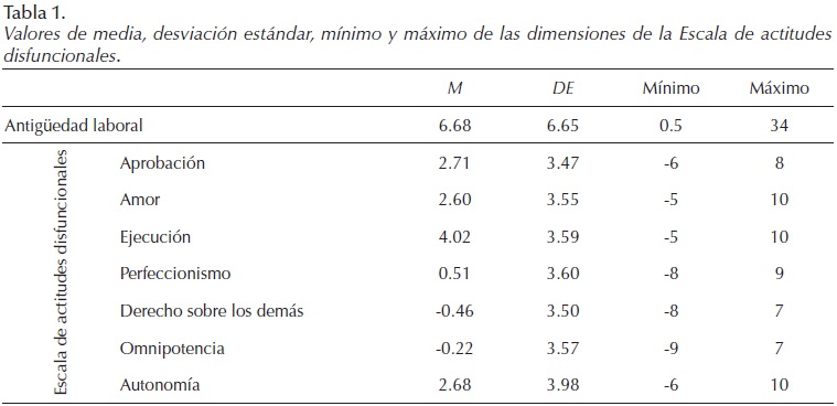 Los valores obtenidos mediante la Escala de Actitudes Disfuncionales evidencian en la muestra niveles más bajos, por lo que deben ser entendidos como áreas de debilidad psicológica, en los factores: Derecho sobre los demás (propensión a desconocer sus propios límites en la interacción con otras personas, desconociendo las necesidades de los otros) y Omnipotencia (creencia irracional y desajustada respecto a sus propias limitaciones). Al respecto, Rodríguez-Suárez (2010) consideró que este tipo de personas tienden a verse más pendientes del grado de competencia alcanzado en el desarrollo de sus tareas, más vulnerables a los fracasos laborales, más centrados en la realización de sus actividades laborales y menos interesados por aspectos tales como la socialización, el ocio y la diversión. Beck y Emery (1985) habían señalado que estas actitudes disfuncionales están vinculadas a temas relacionados con el logro personal y que suponen reglas absolutistas basadas en la fatalidad de los resultados.