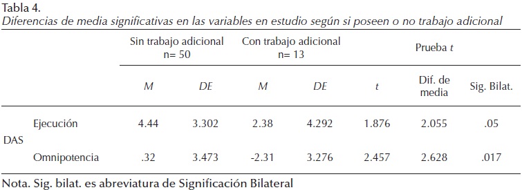 En la tabla 4 se puede apreciar que los factores valores promedios significativamente mayores Ejecución y Omnipotencia del DAS presentan en los sujetos de la muestra sin trabajo adicional. diferencias de media significativas, sugiriendo valores promedio significativamente mayores en los sujetos de la muestra sin trabajo adicional.