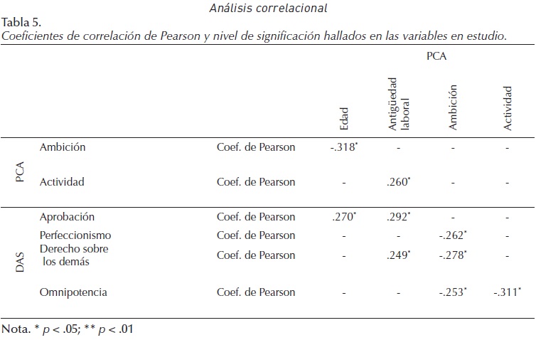 Por otra parte, se observó que la variable Antigüedad laboral presenta una correlación positiva, de baja intensidad y significativa con Actividad, Aprobación y Derecho sobre los demás, lo que indicaría que los sujetos de la muestra que presentan mayor antigüedad laboral tienden a exhibir mayores niveles de actividad, menor necesidad de aprobación y por lo tanto de dependencia respecto a los demás, y menor tendencia por controlar y/o asumir derechos sobre la vida de los otros.