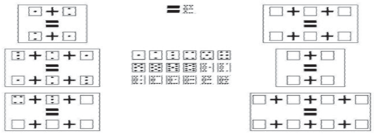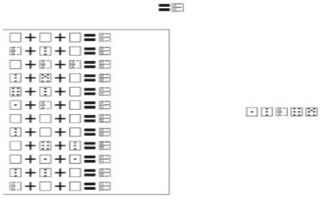 Al presionar el botón "Continuar" aparecía el primer ejercicio que debía resolver. La forma como se presentó el ejercicio varió en función del modo reactivo. En este sentido, en el caso de los participantes con el modo observar, aparecían figuras de fichas con puntos negros de manera similar a las fichas de dominó; para los participantes con el modo leer, en lugar de las fichas aparecía una palabra con el nombre de un número (i.e. tres); finalmente, para los participantes con el modo escuchar, aparecía un botón con la imagen de una bocina que al ser presionado reproducía un audio con el nombre del número. Los números empleados fueron del 1 al 18.