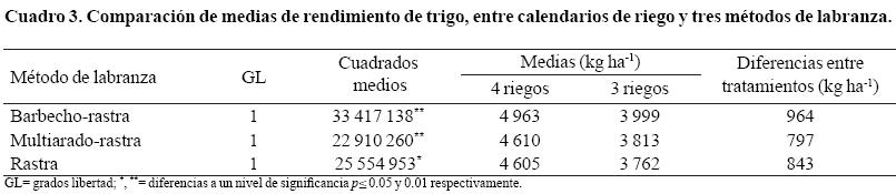 El número de riegos afectó el rendimiento de grano en tres métodos de labranza B-R, M-R y R. En los tres resultó significativo este factor, el calendario de cuatro riegos produjo mayor rendimiento de trigo que el de tres (Cuadro 3).