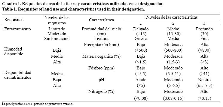 Definición de las características de la tierra (CT). Se definieron siete CT y se dividieron en tres niveles que expresan condiciones favorables o desfavorables (Cuadro 1). Los rangos de los niveles de cada CT fueron definidos con base a la Norma Oficial Mexicana sobre fertilidad y clasificación de suelos (PROY-NOM-021-RECNAT-2000) y FAO (1985). Ajustándolos a las condiciones del área de estudio.