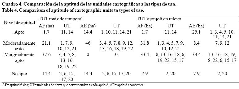 Se observa que en ambos TUT se presenta igual superficie con aptitud física apta (1.7 ha). Para la aptitud física marginal y no apta, existe un decremento de ambas con el TUT ajonjolí en relevo, respecto a maíz de temporal. Lo anterior se debe que las UT 6, 15 y 17 que resultan ser no aptas y las UT 3, 4 y 5 que son marginalmente aptas para maíz, pasan a ser moderadamente aptas para ajonjolí (Cuadro 4). Este comportamiento del ajonjolí en presentar niveles más favorables de aptitud respecto al maíz, se debe que la planta de ajonjolí es más rústica, con menores requerimientos nutricionales y de humedad, para expresar su potencial productivo (Finol, 2001; Ucan et al., 2007).