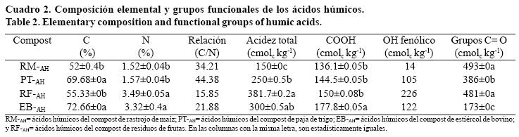 El contenido de grupos COOH fue diferente entre los AH del compost de estiércol de bovino y el contenido de grupos COOH de AH de los compost de residuos de frutas, paja de trigo y rastrojo de maíz. El menor contenido de OH fenólicos fue para los AH del compost de rastrojo de maíz y el mayor para los ácidos húmicos del compost de residuos de frutas. En cuanto al contenido de grupos C= O los AH del compost de rastrojo de maíz y restos de frutas fueron similares, mientras que hubo diferencias estadísticas significativas entre los mencionados anteriormente y los AH de paja de trigo y AH del compost de estiércol de bovino (Cuadro 2).