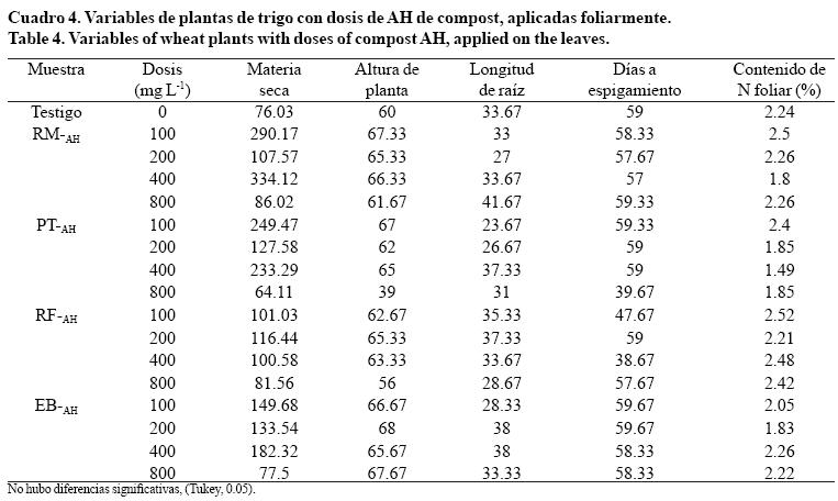 Los datos obtenidos mostraron que la aplicación de los diferentes tratamientos de AH aplicados al follaje, no produjo diferencias significativas en la producción de materia seca, altura de la planta, longitud de la raíz y días a espigamiento de las plantas de trigo (Cuadro 4).