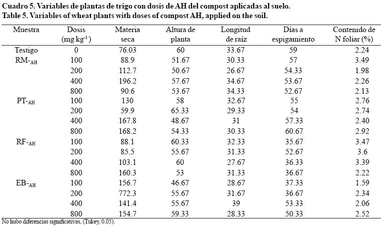Con respecto al efecto de los AH de diferentes compost en la producción de trigo, los resultados mostraron que en la producción de materia seca, no encontramos diferencias estadísticas significativas, similares resultados fueron encontrados por Mackowiak et al. (2001) en plantas de trigo, ellos lo atribuyeron a que las plantas no tratadas desarrollaron retoños.