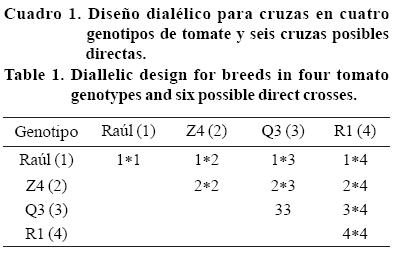 Tomato cultivation (Lycopersicon esculentum Mill.) ranks second place of importance in Mexico, for its big production of 2.22 million tons that reached in year 2007, with an average yield of 35.54 t ha1. For northeast region of Mexico this crop represents an agricultural alternative under protected agriculture conditions due to little water availability and to extreme temperatures that rise up to 48 ºC in summer. Knowledge of general and specific combinatory ability of genetic materials is essential to achieve diverse objectives in a such program of improvement as: develop hybrid and varieties, increase genetic variability and avoid genetic erosion. The aim of this investigation was to evaluate genetic effects of four parents and six possible direct breeds, evaluated in field and greenhouse with variables yield and quality analysis. In combined analysis of variance there were highly significant differences (p≤ 0.01) between environments for fruit average weight and yield as well as significant differences (p≤ 0.05) for days to first harvest, where environmental conditions of each place were different for genotypes in general, including parents and hybrids, fruit average weight and yield, indicating that genotypes behaved different and that hybrids differed in their behavior due to genetic diversity of parents.