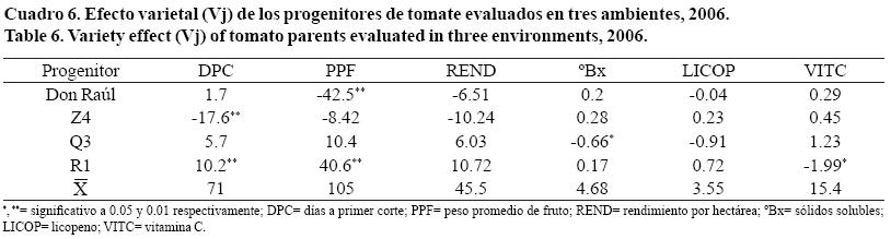 En el Cuadro 6 se muestran los valores de los efectos varietales y su significancia, encontrando que para días a primer corte (DPC) hay diferencia altamente significativa para el progenitor Z4 con signo negativo, indicando que este progenitor se puede explotar por medio de hibridaciones, para obtener materiales genéticos precoces y para el progenitor R1 con signo positivo, indica que este progenitor tiene genes favorables y que puede ser explotado en un programa de mejoramiento, para desarrollar genotipos de tomates tardíos, con alto peso promedio de fruto(más de 105 g) y por medio de cruzamientos incrementar el contenido de vitamina C.