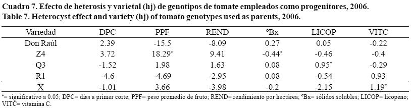 En el Cuadro 8 se presenta los valores de los estimados para la heterosis especifica, donde hubo diferencia significativa para VITC en las cruzas Don Raúl*Z4, Don Raúl*R1, Z4*Q3 y Q3*R1; esto concuerda con Bhatt et al. (2001) que los efectos de dominancia están involucrados en la herencia de la vitamina C en tomate, en las rotras variables no hubo significancia; sin embargo, existieron evidencias de la gran capacidad de estos materiales en la formación de híbridos o variedades para las condiciones semiáridas del noreste de México.