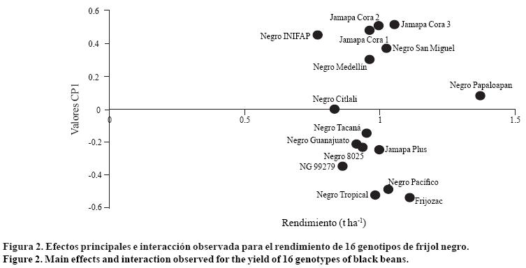 En la Figura 2 y Cuadro 3, se observa que la variedad Negro Papaloapan, además de presentar el mayor rendimiento promedio, mostró reducida interacción con el ambiente y un CP1 cercano a cero, que indica adaptación en todas las localidades de prueba. La línea Negro Citlali mostró la menor interacción con el ambiente (CP1= 0.00238), pero su rendimiento promedio fue más bajo; esta variedad puede utilizarse en los programas de mejoramiento genético, para la generación de líneas y variedades con amplia adaptación. La variedad Frijozac que también obtuvo alto rendimiento promedio, presentó un valor de CP1 de -0.53471, que indica que esta variedad interaccionó fuertemente con el ambiente. La cercanía de las líneas Jamapa Cora 1, 2 y 3 (Figura 2), sugiere alta similitud entre ellas, las tres fueron derivadas de la variedad comercial Jamapa por selección individual.