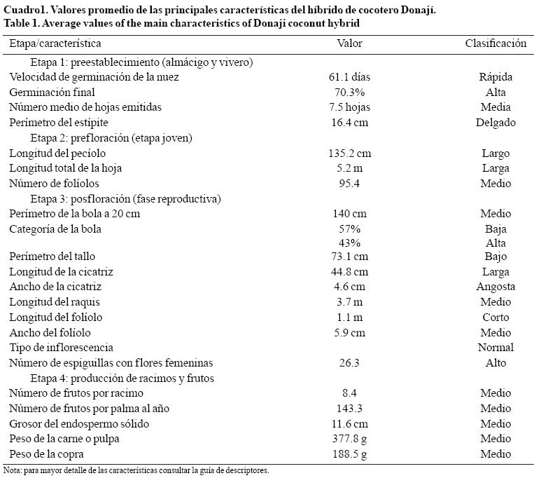 El híbrido de cocotero Donají se encuentra registrado en el Catálogo de Variedades de Plantas con el número COC-011-231110, cuyas características más importantes se presentan en el Cuadro 1.