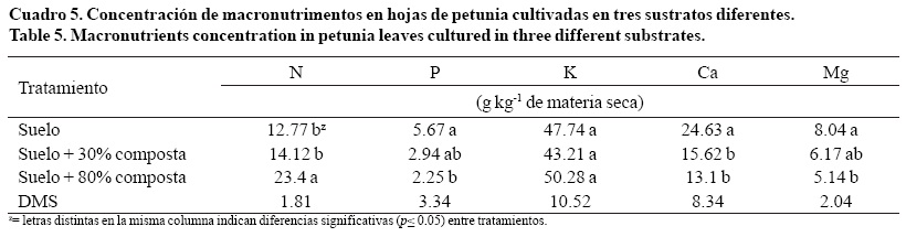 En el Cuadro 5 se presentan las concentraciones de macronutrimentos determinadas en hojas de petunia, establecidas en sustratos con distintas proporciones de composta. En este órgano, no se encontraron diferencias estadísticas entre tratamientos en la concentración de K (p> 0.05). Las concentraciones de P, Ca y Mg fueron mayores cuando las plantas crecieron en suelo agrícola. Dichos valores superaron en 152, 95.6 y 56.4%, respectivamente, a los determinados en plantas desarrolladas en sustrato con 80% de composta (T3). Las concentraciones de P y Mg registradas en T1 no fueron diferentes estadísticamente a las obtenidas en T2. Sin embargo, la concentración de N en hojas fue más alta en plantas establecidas en sustrato con 80% de composta.