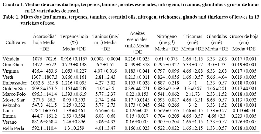Este estudio tuvo como objetivo, conocer el comportamiento poblacional del ácaro de dos manchas (Tetranychus urticae Koch.) en 13 cultivares de rosal y determinar la correlación que existe entre los caracteres bioquímicos (terpenos, taninos y aceites esenciales) y morfológicos (tricomas, glándulas y grosor de hoja), aunado a poblaciones del ácaro de dos manchas. En 13 cultivares de rosal para corte se liberó una población de 100 hembras adultas por planta; una vez establecida la población del ácaro se tomaron muestras de 2 a 7 g de masa foliar con una frecuencia semanal durante 57 días. Se hizo un análisis bioquímico de las muestras y la información resultante se sometió a análisis de varianza y comparación de medias por el método Tukey (p= 0.05). De las poblaciones de ácaros en 13 cultivares (expresados en ácaros-día-hoja) en ocho fechas de muestreo; adicionalmente se hizo un análisis de correlación y regresión múltiple de la población con las variables. El cultivar Luna® presentó mayor desarrollo poblacional con un promedio de 2 784.1 ácaros por día, seguido de Gran Gala®, Verdi®, y Vendela®, con 1 472.5, 1 307 y 1 076 ácaros por día, respectivamente. Por otro lado en los cultivares Movie Star®, Emma® y Virginia® se encontró menor cantidad de ácaros con 3 77.5, 444.7 y 486.4, respectivamente. Del análisis de regresión se observó correlación negativa con los aceites esenciales y positivos en terpenos, grosor de hoja, y contenido de nitrógeno.