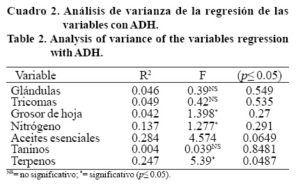El análisis de varianza mostró diferencias estadísticas en las variables terpenos, aceites esenciales, grosor de hoja y contenido de nitrógeno (Cuadro 2).