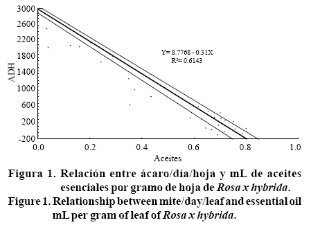 Al realizar una regresión lineal simple entre la concentración de aceites esenciales y los datos de ácaros día hoja registra el modelo y= 8.7768 - 0.3 1x, con R2de 0.6143, encontrando que solamente los aceites esenciales tienen un efecto negativo en las poblaciones de ácaros (Figura 1).