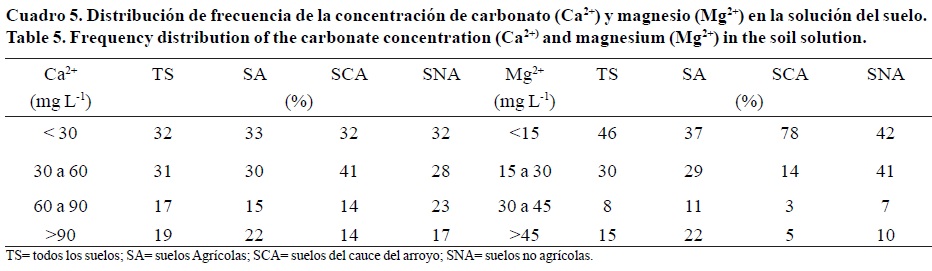 En lo que se refiere a los aniones, sólo en casos muy puntuales se detectó presencia de carbonato en la solución del suelo, mientras que el bicarbonato varió de manera similar sin distingo del tipo u condición del suelo recolectado. En contraste, hubo diferencias notorias en la acumulación de cloruro y sulfato entre los suelos, siendo los terrenos agrícolas en donde se detectó la mayor concentración de ambos aniones y en particular la del cloruro (Cuadro 4).