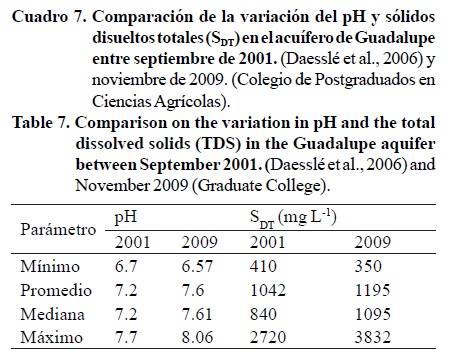 Con la finalidad de evaluar la evaluación de los paramétros hidroquímicos del acuífero, se elaboró el Cuadro 7 donde se compara el valor de pH y los sólidos disueltos totales determinados en septiembre de 2001 por Daesleé et al. (2006) y los analizados en el presente estudio en noviembre de 2009.