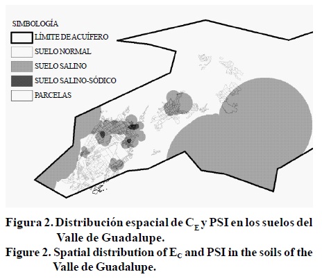 La distribución espacial de ambos parámetros (CE y PSI) se muestra en la Figura 2, donde se aprecia que la región afectada por salinidad se extiende en una superficie aproximada de 333 km2, afectando frutales y vid (CE > 4 dS m-1); y la región de salino-sodicidad cubre 2.72 km2, destinada únicamente al cultivo de uva (CE > 4 dS m-1 y PSI > 15%). De acuerdo con los resultados, suelos con problemas únicamente de sodicidad no se presentan en la zona estudiada.