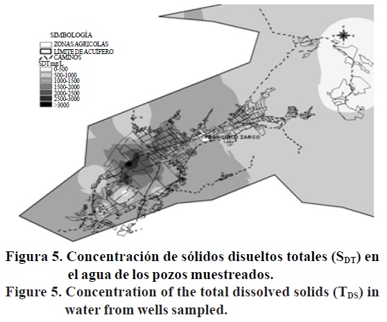 En la Figura 5 se muestra la concentración de sólidos disueltos totales (SDT) en el agua de los pozos muestreados del Valle de Guadalupe, B. C.