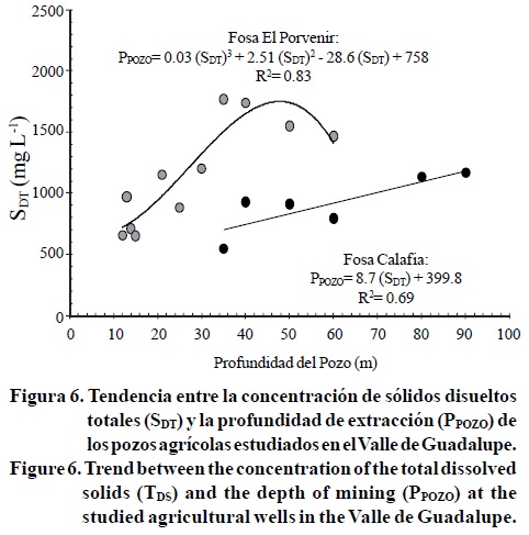 En la fosa El Porvenir a partir de los 20 m de profundidad se incrementa la cantidad de sales a medida que se incrementala profundidad de extracción al menos hasta 60 m. Esta misma valoración se observó para la fosa Calafia. La relación que existe entre la concentración de sólidos disueltos totales del agua y la profundidad de su extracción es 83% en la fosa El Porvenir y 69% en la fosa Calaña.