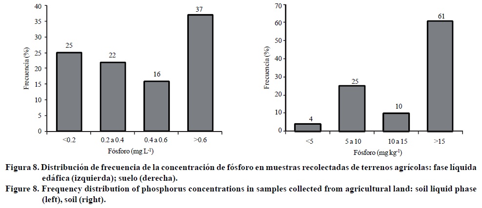 En este caso ocurrió lo contrario (Figura 8 izquierda), que implica que existe una alta concentración de fósforo en el medio edáfico como se muestra en la Figura 8 derecha, donde se observa que 61 %de los suelos dicha concentración supera el valor de 15 mg kg-1. Cabe señalar que en algunos casos extremos las altas concentraciones de fosforo, pueden llegar a afectar el crecimiento y desarrollo del cultivo al inducir reacciones de antagonismo con micronutrientes metálicos, pero en la mayoría sólo se logrará elevar los costos innecesariamente.