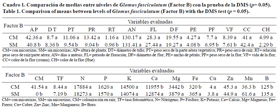 Los efectos de G. fasciculatum sobre ancho de pétalo, peso seco, color y vida de la flor (PE, PF, CH, VF) (Cuadro 1) concuerdan con Scagel y Schreiner (2006) en Zantedeschia inoculados con HMA, quienes encontraron un incremento en la calidad de las flores atribuible a la capacidad de los HMA para modificar la arquitectura del sistema radical a través del desarrollo de hifas en el suelo, favoreciendo la transferencia de elementos minerales y agua a las plantas.