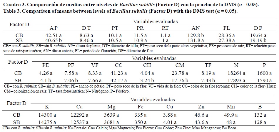 B. subtilis disminuyó en dos días la antesis de las plantas inoculadas (Cuadro 3), lo que significa una menor estancia en invernadero y menos aplicación de productos químicos, que se traducen en menores costos de producción y menor daño al ambiente. Las plantas inoculadas presentaron un peso seco de la flor 7.3% mayor que el de las no inoculadas. El color basado en el ángulo hue fue 24.69% superior al control y la vida de la flor fue 9%mayor. Efecto que puede atribuirse a su modo de acción, el cual plantea que probablemente más de un mecanismo está involucrado en la asociación planta-microorganismo, para operar simultáneamente o en sucesión en el aumento en la incorporación de aguay nutrientes, como fósforo por diferentes vías o mecanismos (Artursson et al., 2006) o para suministrar sustancias activas de crecimiento (Jiménez-Delgadillo, 2004).