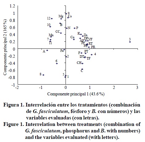 El mejor tratamiento fue T3 (G. fasciculatum, 22 µg ml-1 P, con B. subtilis), seguido de T4 (G. fasciculatum, 22 (ig ml-1 P, sin B. subtilis), T2 (G. fasciculatum, 00 (ig ml-1 P, sin B. subtilis) yT5 (G. fasciculatum, 44 µgml1 P,con B. subtilis); que permitieron lamejor expresión de 19 de las 25 variables evaluadas. Ancho de pétalo (PE), diámetro (DF), peso seco (PF), vida (VF) y color de la flor (CH) y período de floración (F) están vinculadas a una mejor calidad comercial; a mayor tamaño de flor, expresado por (PE) y (DF), mayor peso seco de este órgano. Una mayor intensidad en el color expresa flores con mayor pigmentación; a mayor vida de la flor se amplía el rango en que las flores presentan condiciones aceptables para su comercialización.