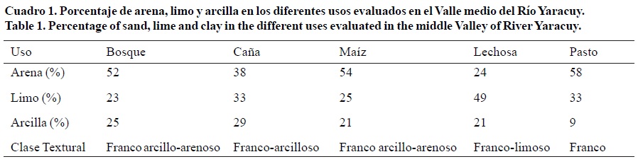 Anticipadamenta a la discusión de los resultados se determinó la clase textural de los diferentes usos, debido a que la textura tiene efectos sobre el comportamiento del suelo, en el Cuadro 1, se presentan los valores de limo, arena y arcilla para los usos evaluados.