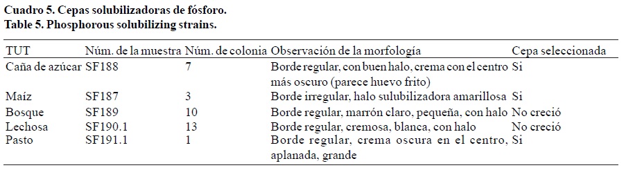 En cuanto al aislamiento de las cepas solubilizadoras de fósforo se tomaron también cinco cepas. Las cuales fueron identificadas de esta manera SF187, SF188, SF189, SF190.1 y SF191.