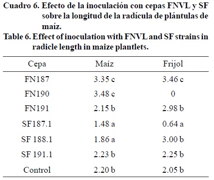 En el Cuadro 6, se presentan los resultados obtenidos en la prueba de bioestimulación, los mismos muestran que el mayor crecimiento radicular se observaron en las cápsulas con semillas de maíz (Zea maiz L.) inoculados con las cepas FNVL 187 y NVL 190 con valores estadísticamente superiores (p< 0.05) al resto de los tratamientos aplicados, mientras que cuando se evaluaron las cepas en el cultivo de caraota Phaseolus vulgaris L., las cepas más eficientes fueron la FNVL 187 y la FNVL 191 respectivamente, estos resultados obedecen a que las bacterias expresan su eficiencia de inoculación en este cultivo, mientras que el resto de la cepas no, Landis (2000) y Peña y Reyez (2007), estudiaron que los niveles altos de nitrógeno promueven una rápida división y elongación celular, demostrándose así la importancia de la aplicación de estas cepas para estimular el crecimiento de las plántulas.