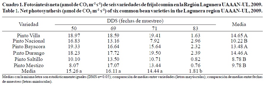 Los valores de fotosíntesis neta (Pn) de las variedades Pinto Villa, Pinto Durango y Pinto Bayacora se comportaron de manera similar con 14.65, 14.46 y 13.48 (imol de CO2 m-2 s-1 respectivamente. No obstante presentaron diferencia estadística frente a las variedades Pinto Nacional, Pinto Mestizo y Pinto Saltillo las cuales presentaron 10.22, 9.83 y 8.78 (imol de CO2m-2 s-1 respectivamente (Cuadro 1). Entre las fechas de muestreo hubo diferencia estadística sólo en la última fecha donde la cantidad de CO2 que asimiló la planta fue muy baja debido a que se encontraba en la etapa de senescencia.